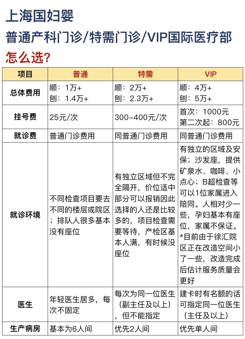💙国妇婴(徐汇)的普通/特需/VIP大致情况对比可以参考本篇主图,主要从总体费用(挂号费、就诊费)、就诊环境、医生及产房这几个大家最关心的问题作了总结对比。*合计费用是比较标准的统计结果,因为各种原因可能会增加产检项目/次数/房晚,整体费用会再上去一些。