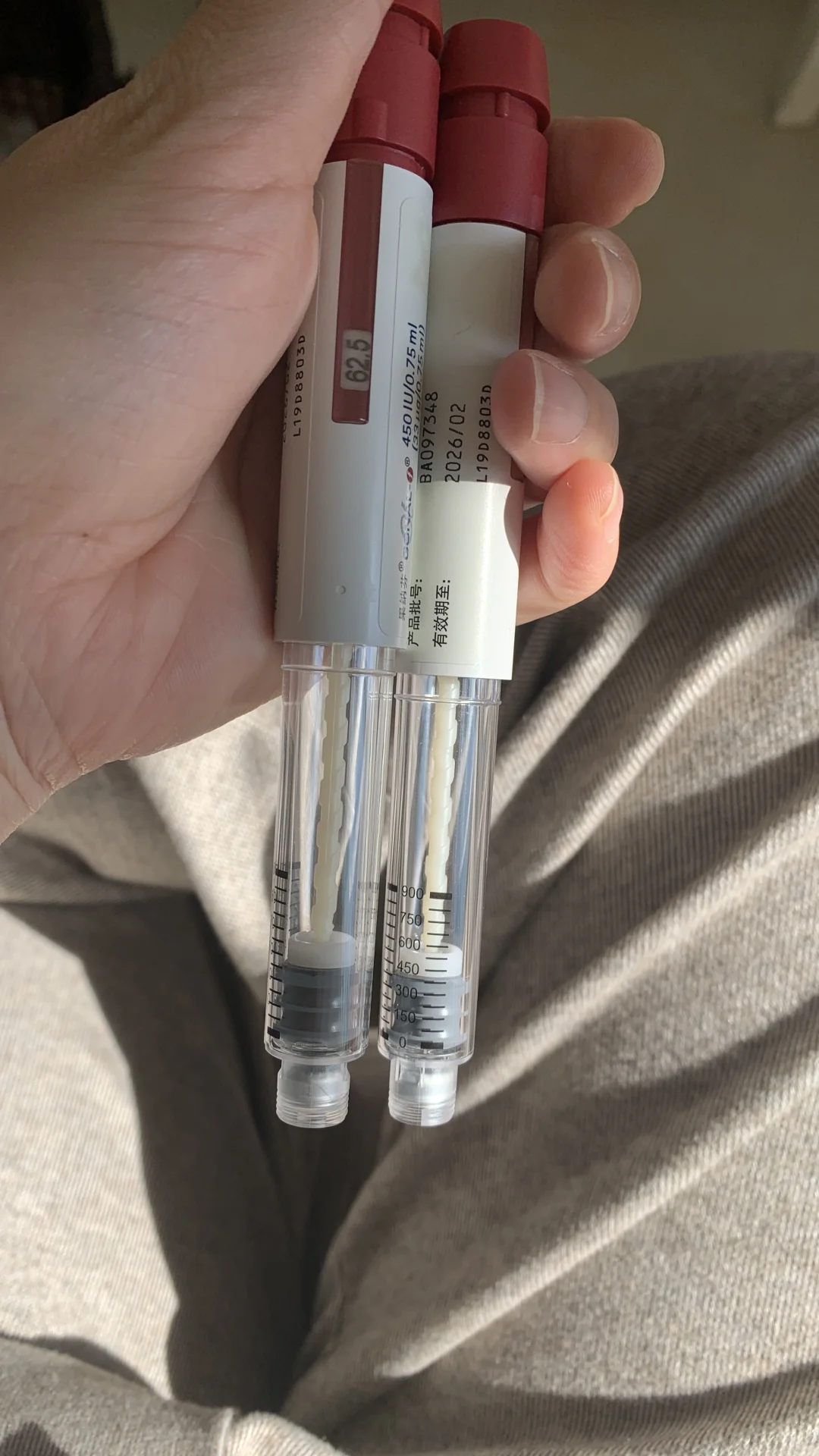 我剩余的也看着和你一样,看着是在零刻度线,不知道是有还是没有,有也不知道有多少。怎么确认有多少呢?我是一天打187.5,打了两天,第三天不够还拆了一支新的,打的第一支的75和第二支的112.5。