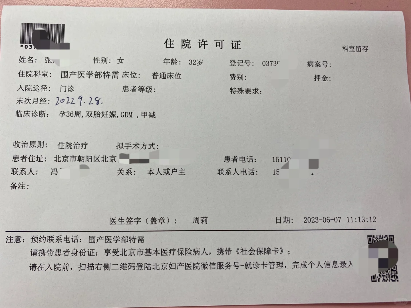 6.14号37周足月,本打算6.19剖,医生说等不了,6.15-6.16让选一天,家人商量决定选6.15号,相当于下次37周来产检就直接办住院了,而且家人还一直理解不了为啥不能晚几天(生怕生出来小,认为在肚子里孩子发育的好),看人家38周左右生的也很多,其实我也不理解,我看还有38周多的呢,但是就听医生的吧,在肚子里没有生出来让我放心给开了住院单特需产房,让把条送到了8楼住院部,住院部说等电话,这没啥悬念了吧,不会又说特需没床位吧